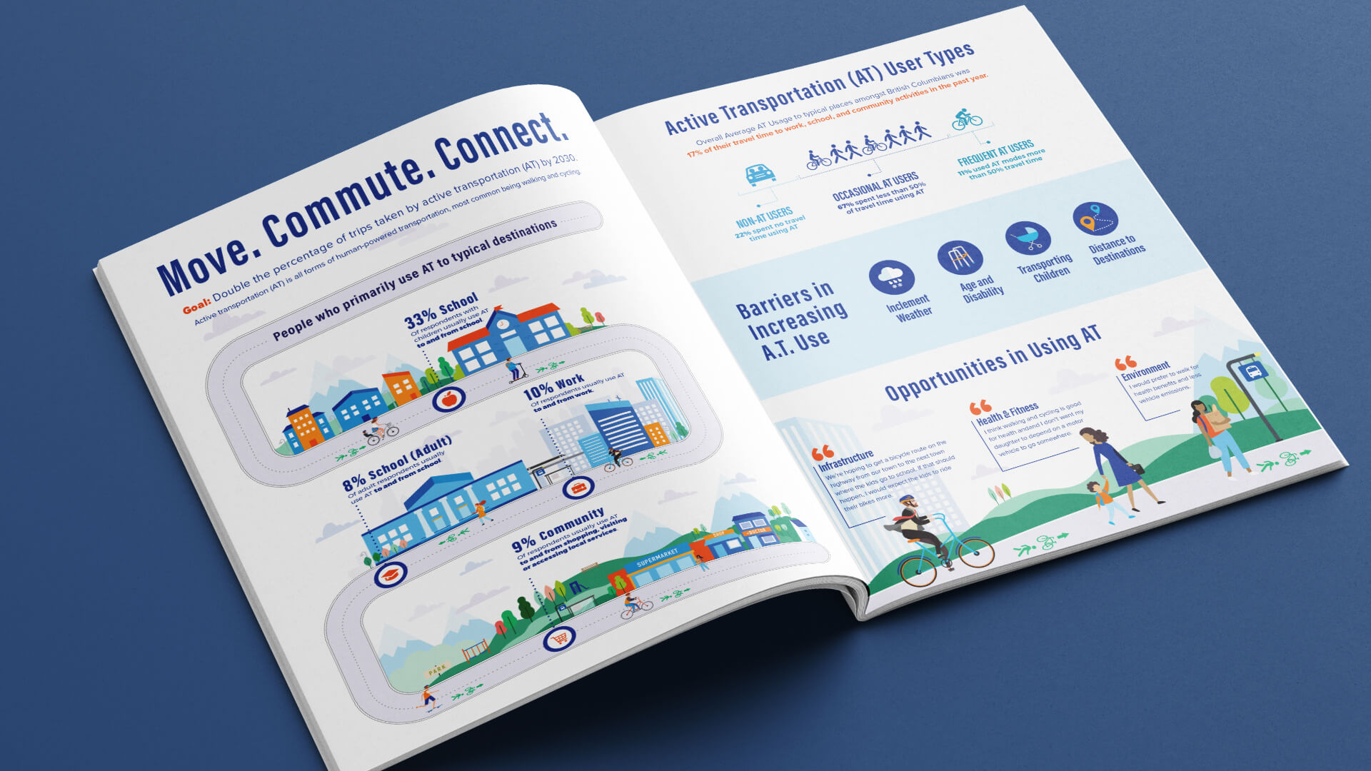 We worked closely with the Ministry of Transportation & Infrastructure of British Columbia and BC Stats on developing the province’s Active Transportation Strategy General Population Survey Report (2019), Report Card, Infographics, & Web Icons. In which we provided extensive services in creative conceptualization, graphic design, data visualization, and copywriting/editing.